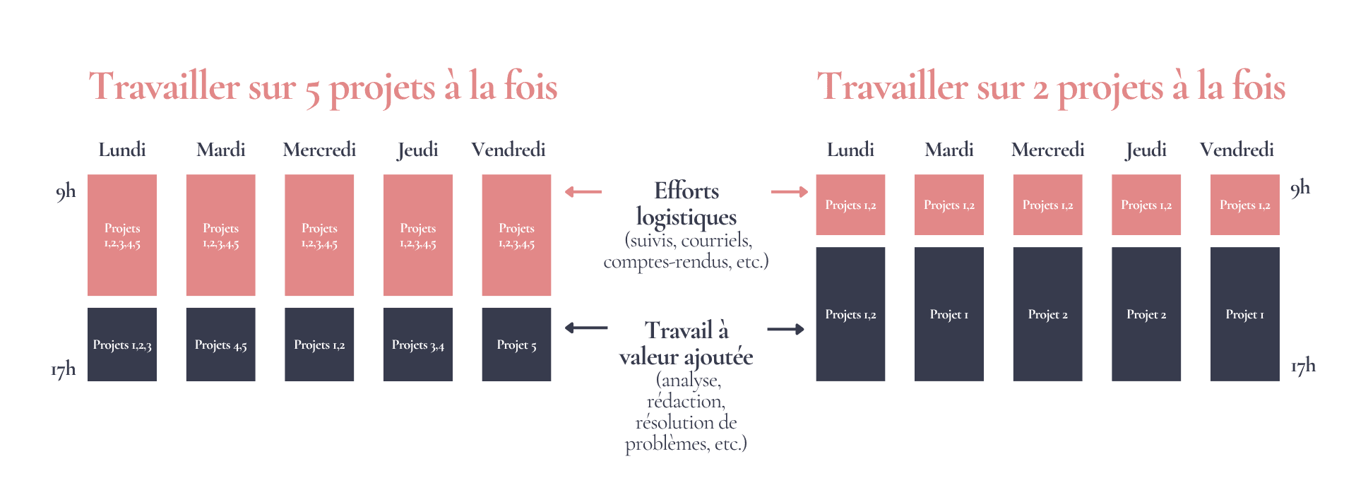 Ces tâches n'apportent aucune valeur ajoutée directe ni au client ni à l'organisation. Elles sont nécessaires administrativement, mais elles ne font pas avancer le livrable. Le piège est mathématique : plus vous menez de projets de front, plus la part de votre temps consacrée aux efforts logistiques explose, au détriment du travail de fond.